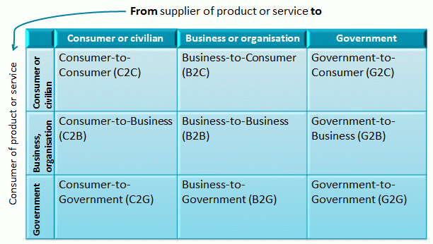 Below the picture shows the different types of e-commerce parties that can be involved in e-commerce. You notice the classic B2C, B2B one, but also C2C, C2B (web markets). And also variations where the government is one of the parties